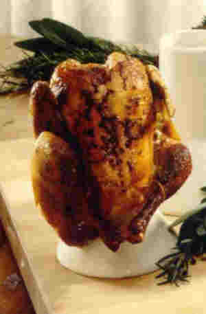 "Chicken on a Throne" - Or "beer-butt" chicken, has become one of the favorite ways to cook the ever popular chicken. Simply put, you get a container (originally it was a beer can), fill it with beer, wine, juice, coke, etc. Then add garlic, basil, apples, etc. Next, place the seasoned chicken on top of the Chicken Sitter and place it on the grill. The throne holds the chicken upright, adds flavor from the ingredients and makes a great presentation. The heat from the grill not only cooks the chicken but additionally heats the liquid. Thus the moist flavor engulfs the bird from the inside out. Moist and flavorful chicken is the result! HINT: Always use a Chicken Sitter that will not tip over and place a foil tray (made from heavy duty aluminum foil) under the chicken to prevent the grease of the skin from dripping directly into the fire and causing flare-ups which will burn the chicken.
