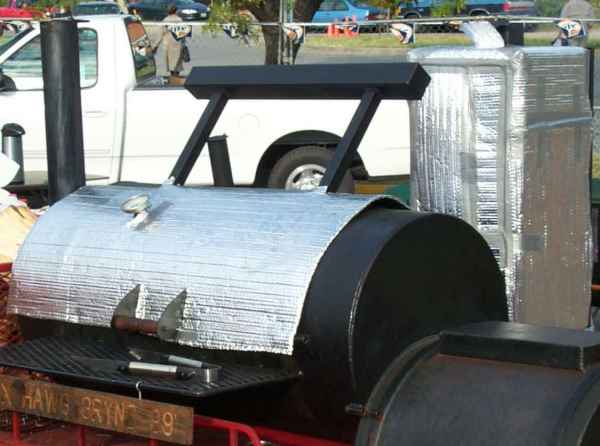 Want to hear a particular topic? Let us know! Did you miss our last issue? Read it here! Keep On Barbecue'n, P.S. Winter cooking is Cool! It happens every year, just about this time. The first cold snap in South Mississippi means that Fall is actually going to cool things off. While most of the US has already had some cold nights, our Canadian friends are feeling wintry weather. Not surprisingly, Canadians seem less inclined to let inclement weather effect their outdoor cooking schedule. With a little planning and creativity we can all extend our outdoor cooking season to year round. We are mostly concerned with the effect on the cooker, rather than on the cook. We can dress for the occasion; the cooker needs our help. So let’s look at the factors that rob our pits of BTUs, analyze the effect they have and figure our way around them. The big three, in increasing effectiveness, are: temperature, wind and moisture. And their effect is progressively more severe from broiling, to roasting, to barbecuing to hot smoking. So that we all agree on what those terms mean, it is my belief that at least 95% of those who call what they are doing in a pit at 225-350 degrees “smokin’”are really roasting in a smoky atmosphere at the top of that range and approximating barbecue at the bottom of that range. True hot smoking is done below 190 degrees and cold smoking is done below 90. Barbecuing is done between 190 degree and 225 degrees, roasting is done between 225 and 450 and broiling is done above 500 degrees. It stands to reason that the longer the cooking takes the greater the effect of foul weather. Unless it is pouring rain into the grill, successful broiling just requires that you boost up the fuel pile to supply the extra BTUs needed to reach the desired temperature for the 10 minutes or so needed to broil a steak. Long term cooking is another matter entirely. The ambient (outside) temperature has only a small impact on the grill, but when accompanied by wind and water, the effects on cooking temperatures and time can be dramatic. Even when the summer heat is upon us, water sucks up BTUs like a biscuit does gravy. While barbecuing pork ribs near Seattle, the weather began to become a little misty and breezy. I was monitoring the temperature in the cooking chamber with a digital thermometer with its remote probe resting on one of the slabs. Although, the grill and I were under cover and the temperature was mild, I watched the temperature inside the cooking chamber take a 20 degree drop in a matter of seconds. Had I not been watching at that moment, I would have been unaware of the sudden loss of temperature. So, shelter from moisture is essential for maintaining anywhere near normal cooking temperatures and times when roasting, barbecuing or “smokin’.” To start without shelter with threatening weather is rash, to start during any inclement weather is folly. There are a variety of temporary shelters that can be had reasonably, but if you enjoy cooking out and don’t want the weather to control you, a cooking shed, patio, covered deck can change your life. Next to moisture, wind is the most offensive. Often you can move your portable cooker to a more protected area. If not you can put up a temporary wind break. But, as above, you can construct a more permanent shelter. You may also wrap the cooking chamber in foil covered glass fiber insulation as a temporary, but effective solution.